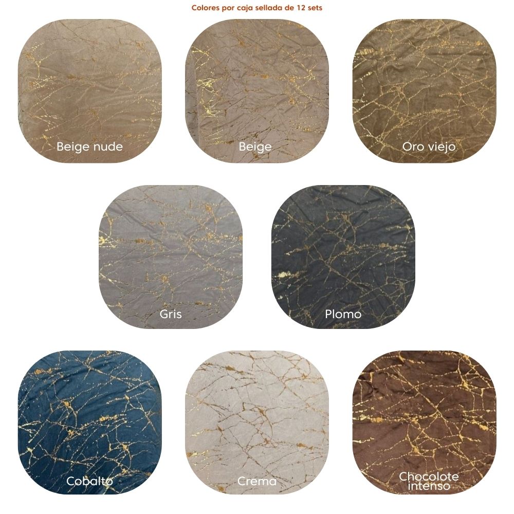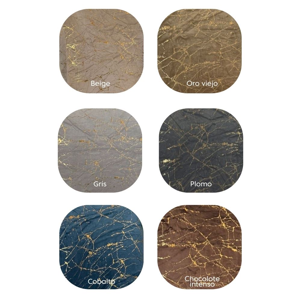 🎨 Colores: chocolate intenso, gris, plomo, beige, cobalto y oro viejo.